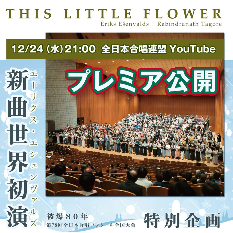 2025年11月22日第78回全日本合唱コンクール全国大会大学職場一般部門の1日目に行なった作曲家エシェンヴァルズ氏による自作の世界初演音源を、12月24日(水)21:00より全日本合唱連盟のYouTubeチャンネルでプレミア公開します。