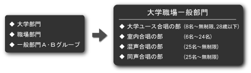 ※大学職場一般部門には、中学校部門・高等学校部門に加盟する合唱団は出演できません。