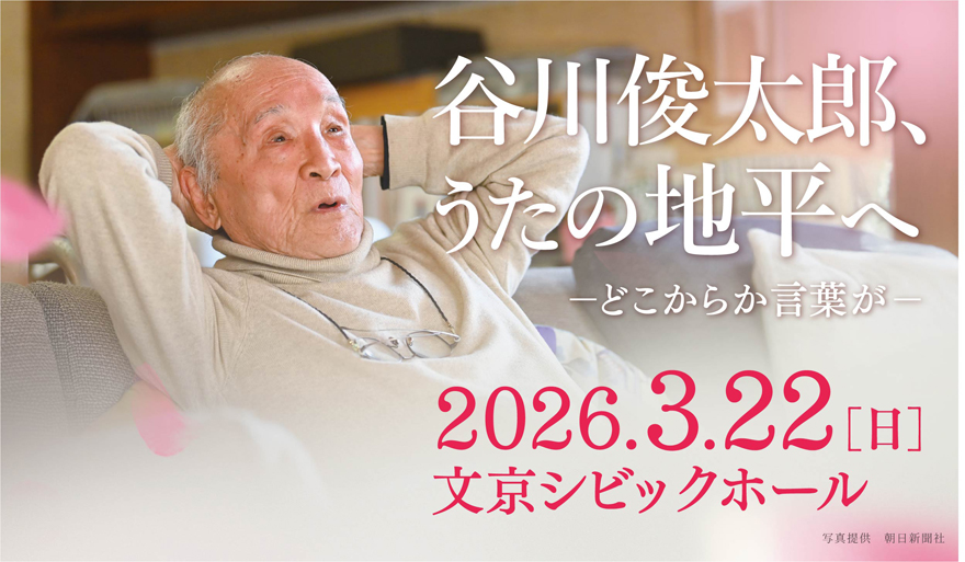 2026年3月22日(日)に東京都文京区の文京シビックホールで開催するコンサート「谷川俊太郎、うたの地平へ-どこからか言葉が-」の入場券の販売を全日本合唱連盟STORESで販売中です。7名の作曲家による委嘱初演・編曲はじめ数々の作品を7つの合唱団による演奏でお届けします。ご来場の方と一緒に歌うコーナーもあります。谷川俊太郎さんの言葉の世界を十分にご堪能いただける3部構成。是非ご来場ください。