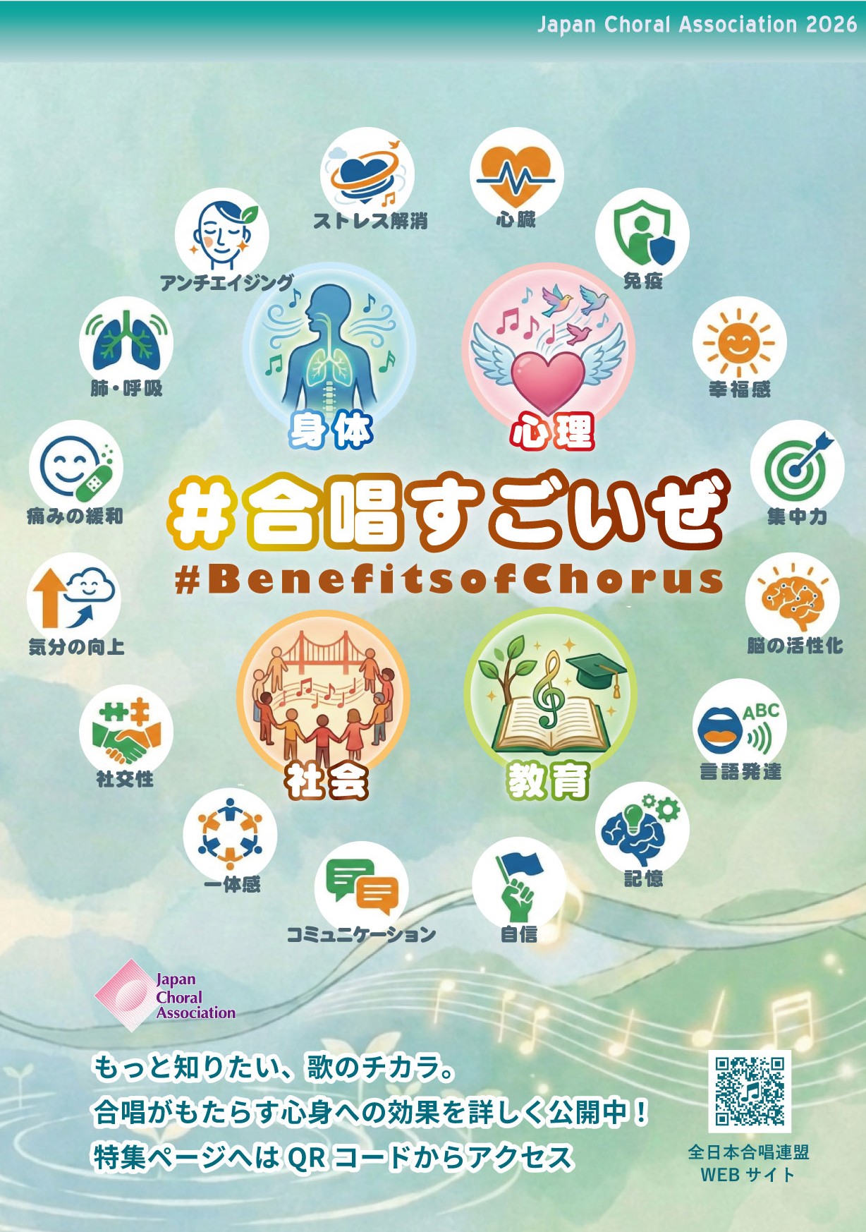 心身の健康や教育・社会性にとって、さまざまな効用があることが分かっています。科学的にも、感情的にも、合唱は私たちの毎日を豊かにしてくれる最強のメソッドです。