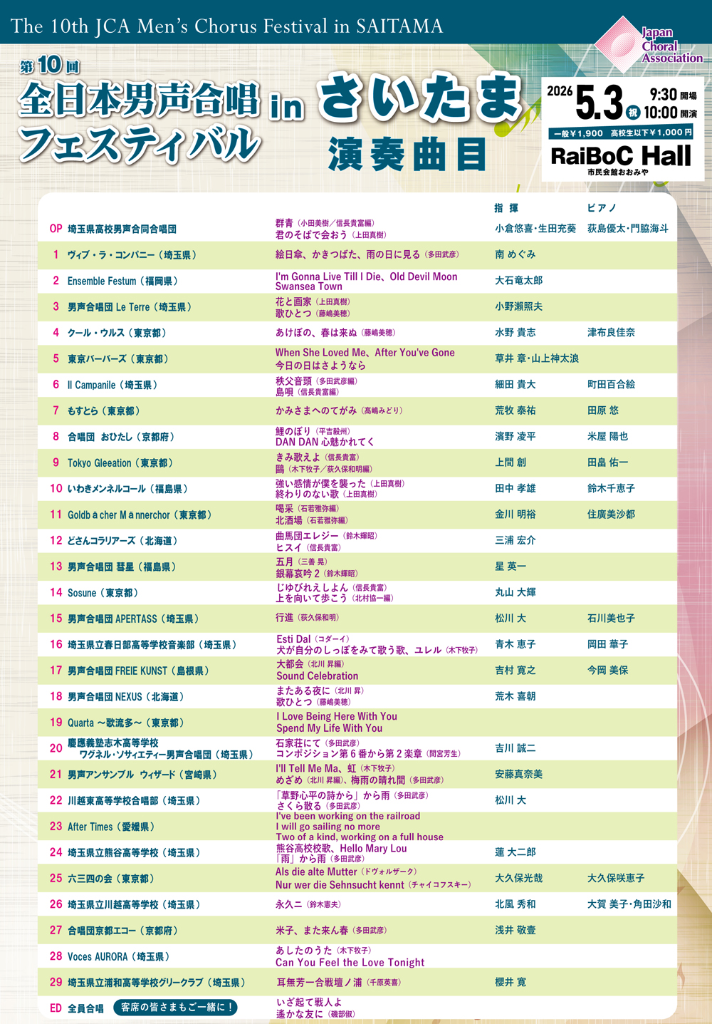 後 援:埼玉県・埼玉県教育委員会・さいたま市・さいたま市教育委員会・日本男声合唱協会