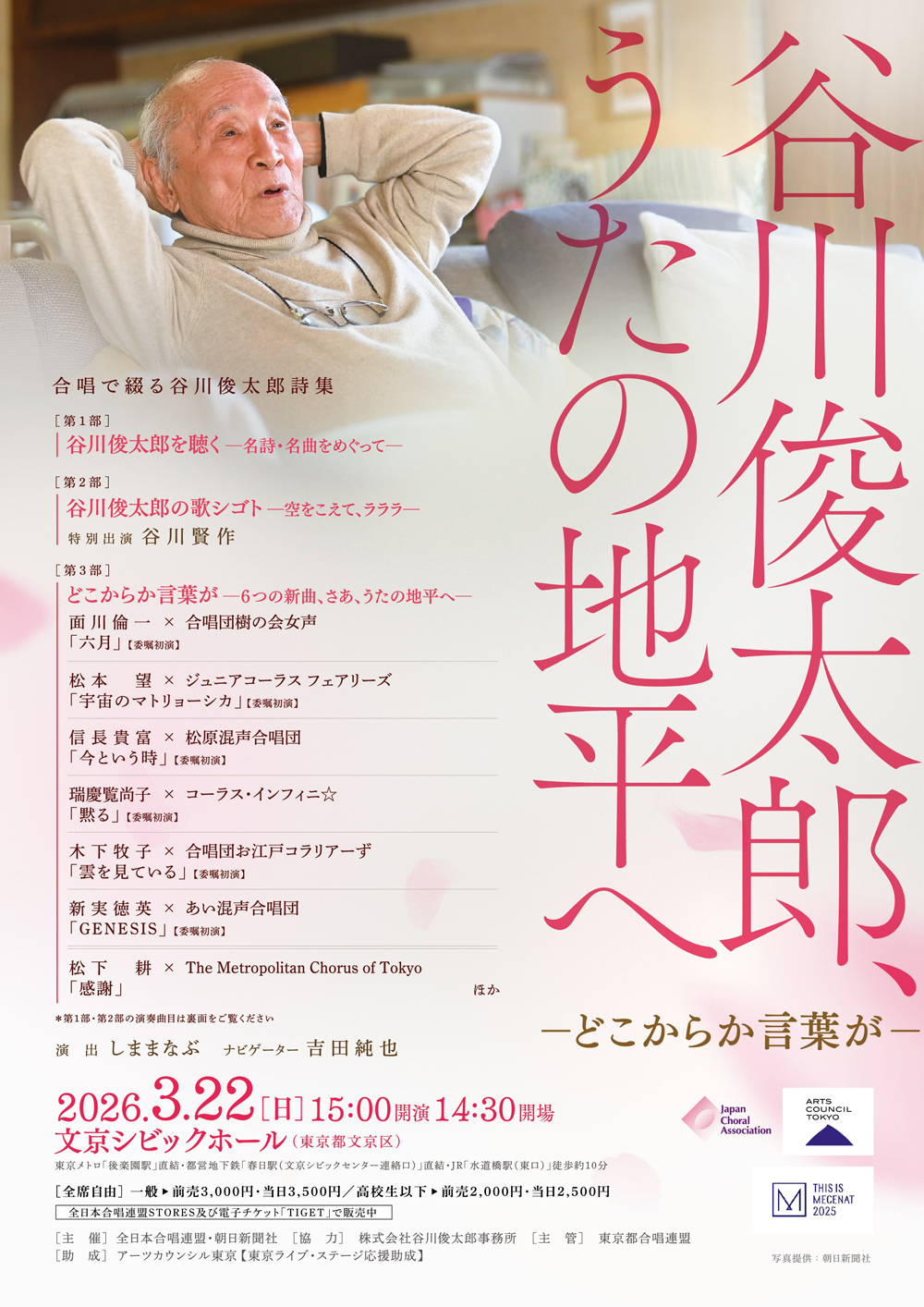 2026年3月22日(日)に東京都文京区の文京シビックホールで開催するコンサート「谷川俊太郎、うたの地平へ-どこからか言葉が-」の入場券の販売を全日本合唱連盟STORESで販売中です。7名の作曲家による委嘱初演・編曲はじめ数々の作品を7つの合唱団による演奏でお届けします。ご来場の方と一緒に歌うコーナーもあります。谷川俊太郎さんの言葉の世界を十分にご堪能いただける3部構成。是非ご来場ください。