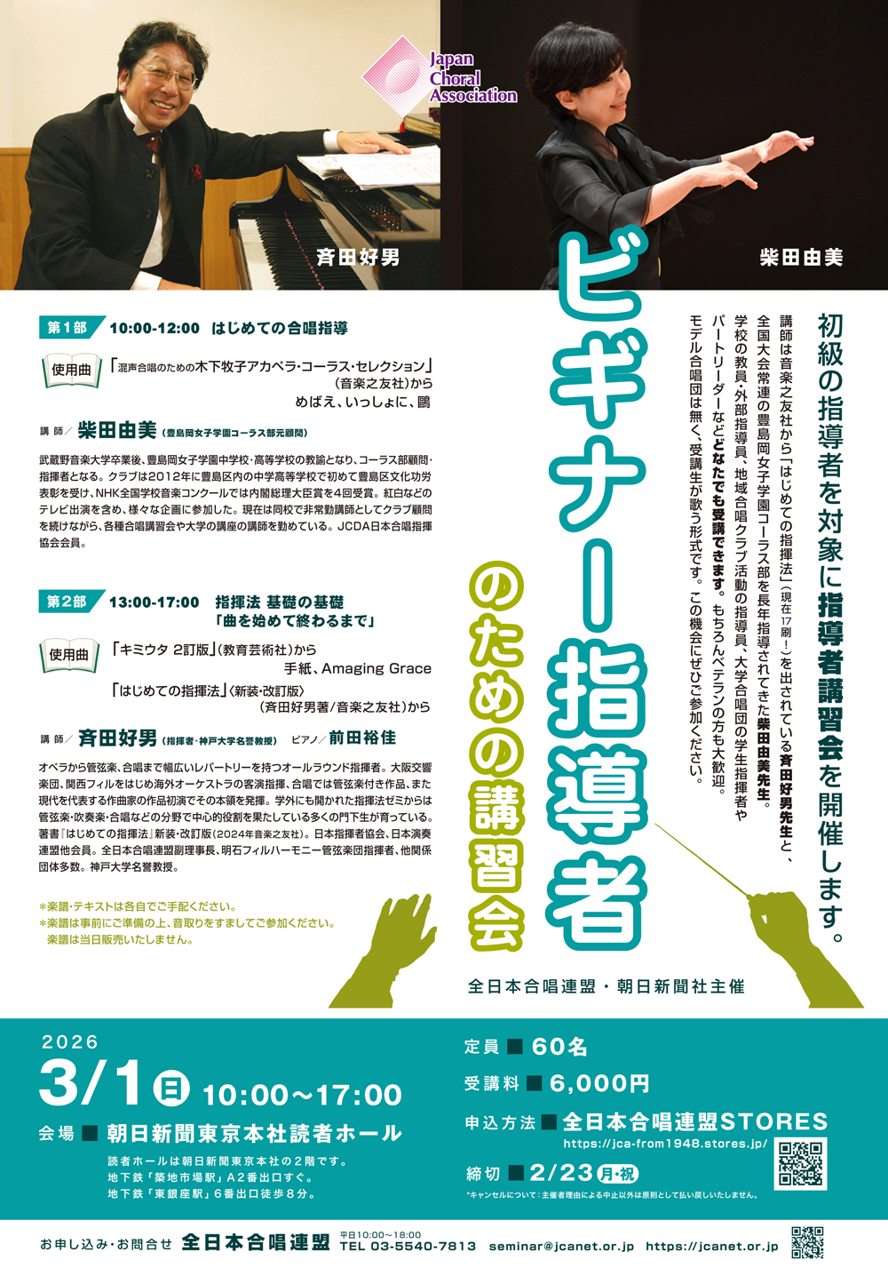 ■講 師:斉田好男(指揮者・神戸大学名誉教授)(指揮法 基礎の基礎)、柴田由美(豊島岡女子学園コーラス部元顧問)(はじめての合唱指導)